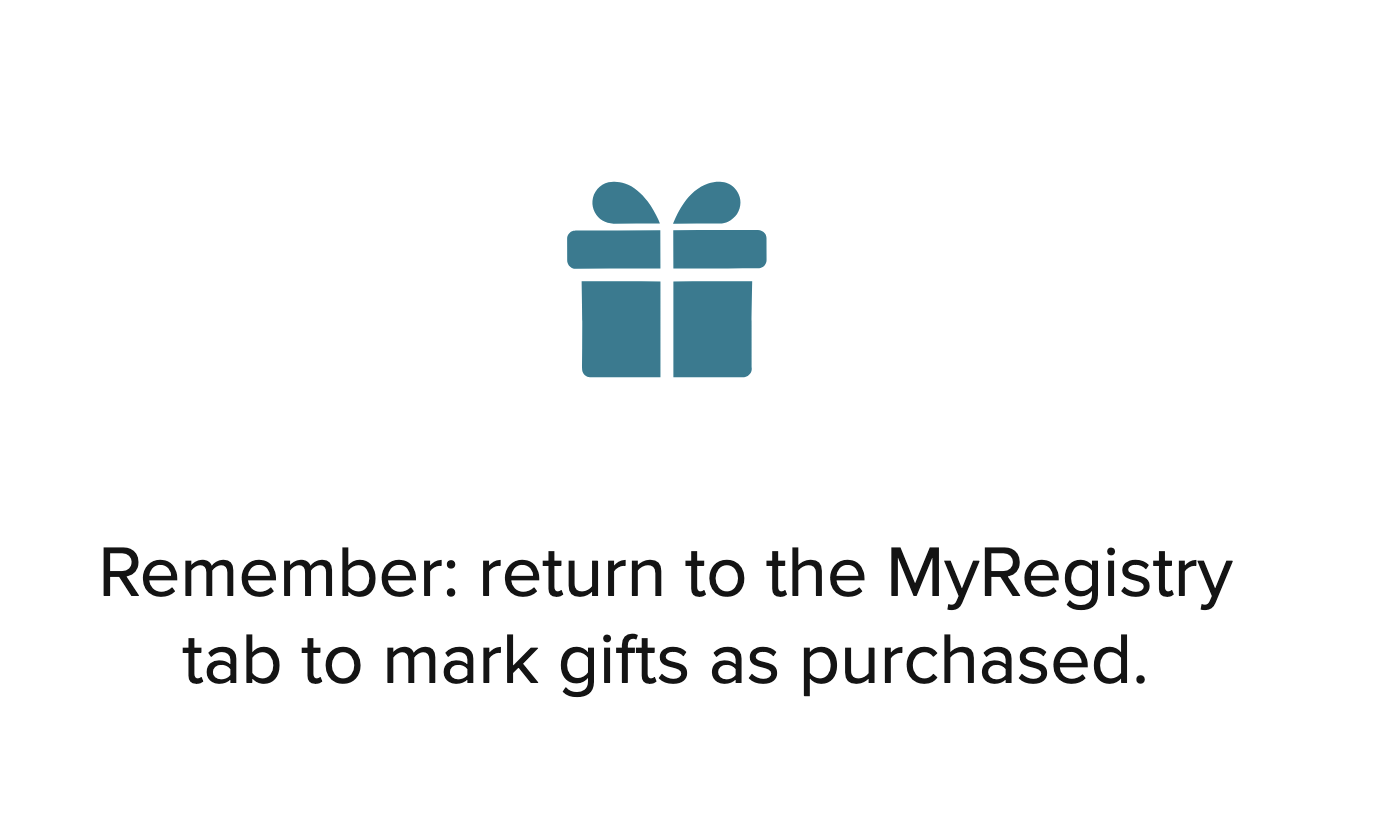 All set! MyRegistry will send you a reminder email to mark the gift as purchased in case you forget/lose the tab. Shipping updates if applicable will be sent through the online retailer.